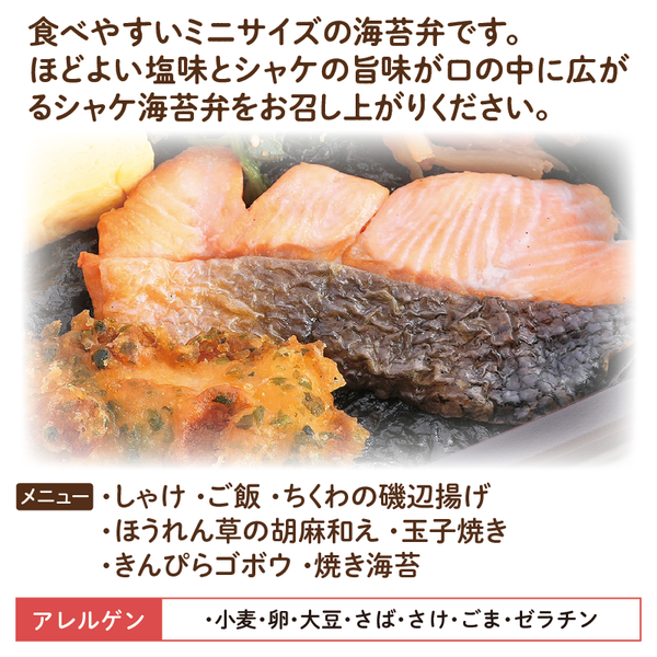 食べやすいミニサイズの海苔弁です。ほどよい塩味とシャケの旨味が口の中に広がるシャケ海苔弁をお召し上がりください。
