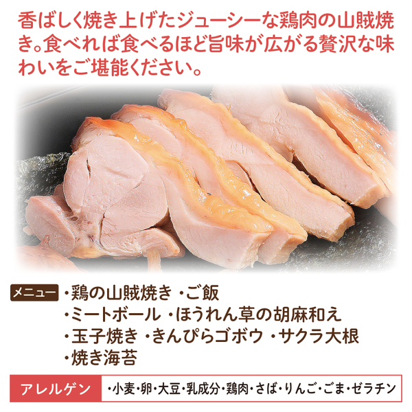 ご飯(九州産)、鶏もも肉、ミートボール、玉子焼、ほうれん草の胡麻和え、きんぴらゴボウ、サクラ大根、焼き海苔(一部に小麦、大豆含む)※仕入れの状況により、産地が変更になる場合があります。■添加物トレハロース、調味料(アミノ酸等)
